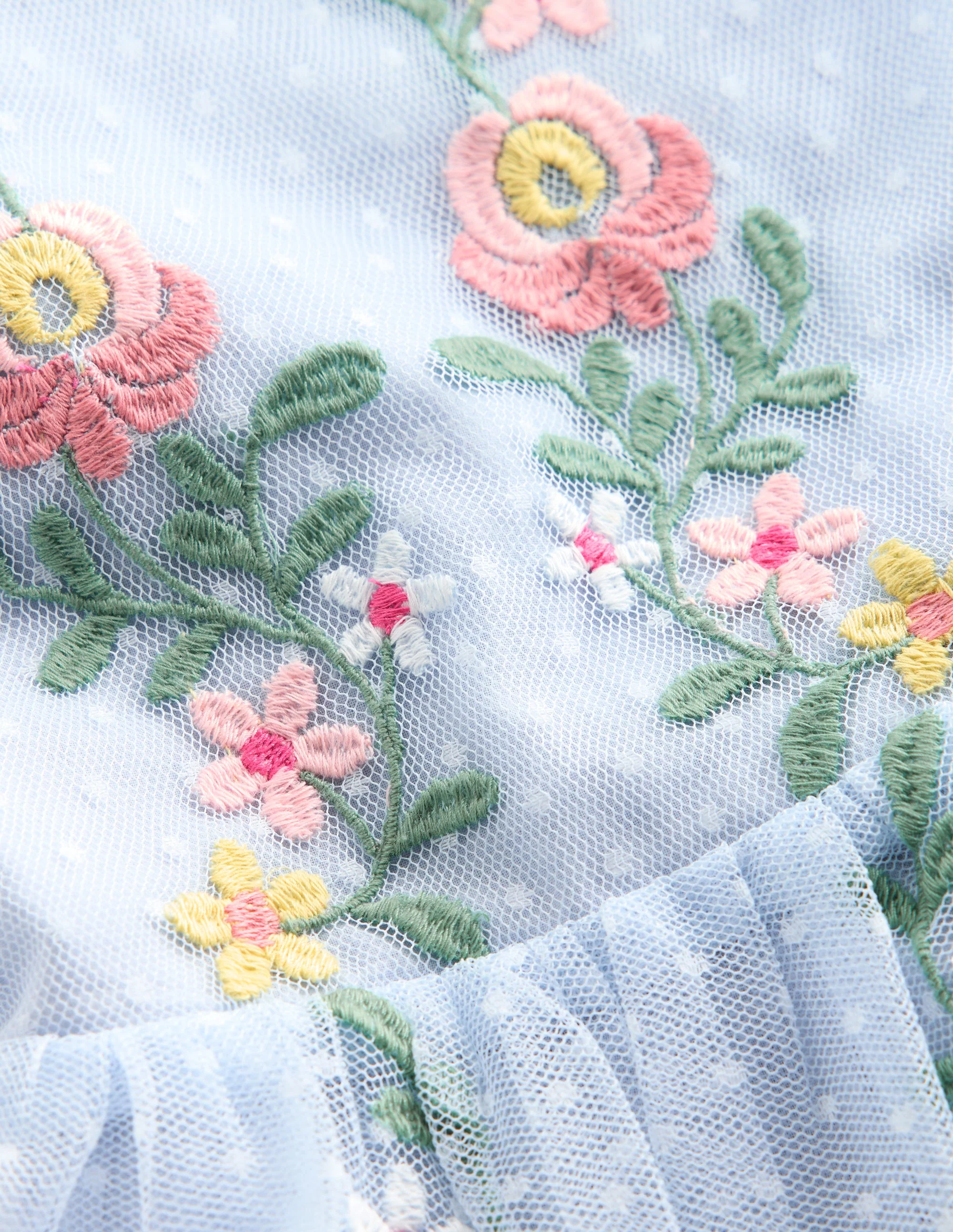 Imagine some floaty tulle. Add some subtle dots. Then add some embroidered flowers (on the cross-back straps too). And finally add some ruffles. Et voilà, you’ve got this very special keep forever dress.
